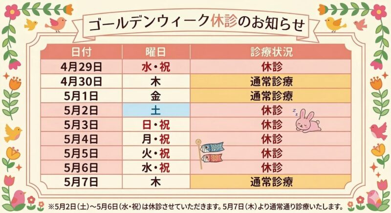 ゴールデンウィークは5月2日~5月6日まで休診となります。連休前後は混雑が予想されます。お薬がなくなりそうな方は早めに受診をお願いいたします。